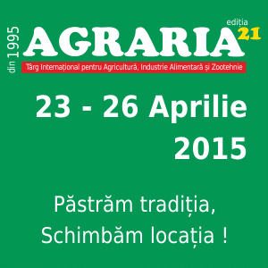 AGRARIA - Târgul Internațional pentru Agricultură, Industrie Alimentară și Zootehnie își schimbă locația în 2015. Expoziția, lider de peste 20 de ani pe piața evenimentelor agricole din Transilvania, se va desfășura în perioada 23-26 aprilie 2015 la Jucu, în județul Cluj, Parcul Industrial TETAROM III.