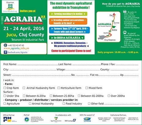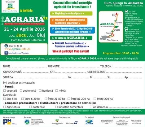 AGRARIA - Târgul Internațional de Agricultură, Industrie Alimentară și Zootehnie, organizat începând din anul 1995, a devenit evenimentul anual emblematic în domeniu pentru zona Transilvaniei. Expoziția, lider de peste 20 de ani pe piața evenimentelor agricole din Transilvania, se va desfășura zilnic între orele 10:00-18:00, în perioada 21-24 aprilie 2016 la Jucu, în județul Cluj, Parcul Industrial TETAROM III,