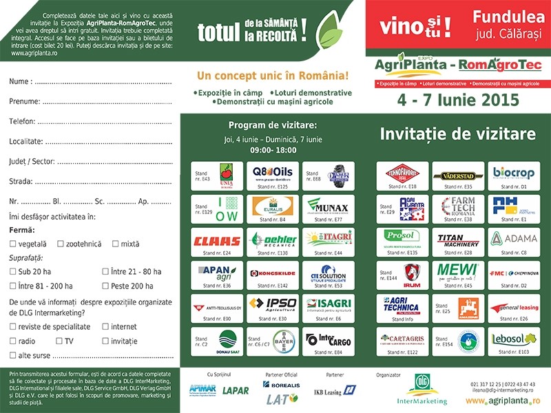 Expoziția AgriPlanta – RomAgroTec 2015, va avea loc în perioada 4 - 7 iunie 2015, în Fundulea, județul Călărași.