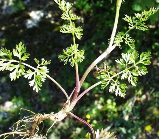 5. Descriere plantă: Plantă cu miros neplăcut, de ploşniţă, penetrant şi persistent, cu rădăcina pivotantă, tulpina dreaptă, ramificată, de 15-60 cm, frunze glabre, penat-sectate, cele inferioare peţiolate, cele superioare sessile, flori în umbele, lipsite de involucru, involucel cu 2-3 foliole scurte, petale albe, adânc bifidate, fruct caracteristic, mai lat decât lung.