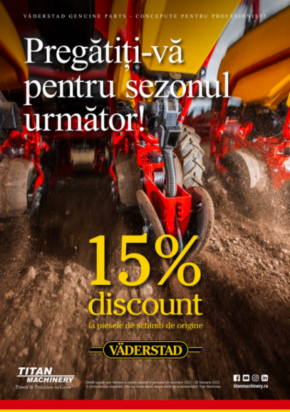 Titan Machinery România oferă în sezonul rece, respectiv în perioada 18 noiembrie 2022 - 28 februarie 2023 un discount de 15% la piesele de origine VÄDERSTAD.