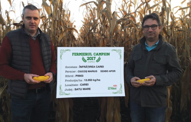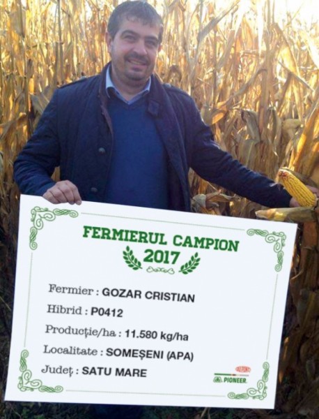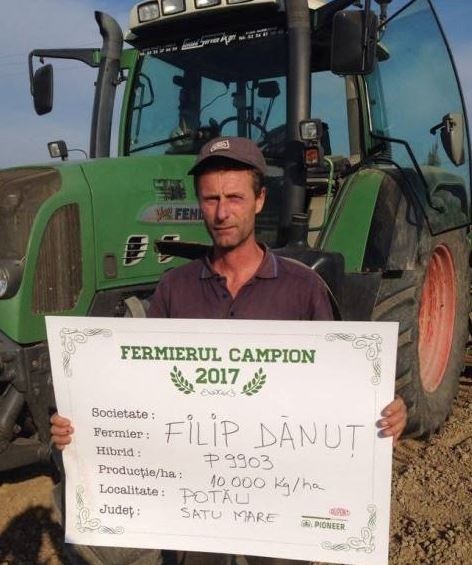 Tot în județul Satu Mare, localitatea Carei, a devenit fermier campion și domnul Ciucoș Marius din cadrul societății Înfrățirea Carei, care a obținut 13.950 kg/ha cu hibridul P9903. “Lucrez 2.100 ha, iar pe 560 ha am avut anul trecut porumb, în cultură neirigată. Am semănat după rapiță, grâu și porumb. Am arat din toamnă, la adâncimea de 25 cm, o parte din teren, 25-30%, a fost prelucrat cu o mașină de prelucrat solul, restul suprafeței a rămas așa. În primăvară am nivelat, am pregătit terenul cu combinatorul, o trecere sau două în funcție de cum era solul. În toamnă am aplicat 100 kg/ha sare potasică, 250 kg/ha nitrocalcar la semănat plus 150 kg/ha la prășit. Am semănat începând din data de 7 aprilie și am terminat pe 20 aprilie. Cultura a beneficiat de o prașilă, în faza de 4-5 frunze. Am erbicidat o singură dată și doar pe o porțiune mică am aplicat un tratament. Recoltatul a avut loc începând cu 25 septembrie și până la sfârșitul lunii octombrie. Anul acesta voi semăna în jur de 530 ha și am ales hibrizii P9903, P9911 și P9415”, a punctat fermierul campion.