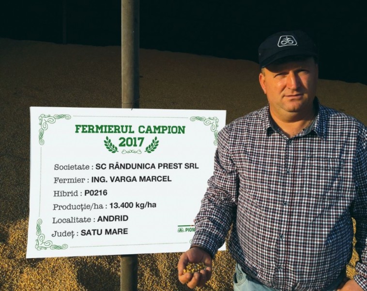 Următorul fermier campion este domnul Marcel Varga din localitatea Andrid, județul Satu Mare. Acesta lucrează 1.184 ha, porumb a semănat anul trecut pe 346 ha și a obținut 13.400 kg/ha cu hibridul P0216.“În toamnă am arat la 28-32 cm, în funcție de solă, pentru că am semănat după grâu, dar și după porumb. După care în primăvară, am nivelat și am intrat cu combinatorul. La pregătirea patului germinativ am aplicat și complex triplu 16, între 230 și 250 kg/ha. Am semănat in intervalul 4-20 aprilie, am erbicidat în vegetație, am efectuat o prașilă în stadiul de 5-6 frunze, când am aplicat nitrocalcar, tot între 230 și 250 kg/ha. Am început recoltatul în jurul datei de 15 septembrie, în funcție de hibrizii semănați. În această primăvară voi semăna 318 ha, toată suprafața doar cu hibrizi Pioneer: P9903, P0216, P9900 și P0412”, a punctat agricultorul Marcel Varga.