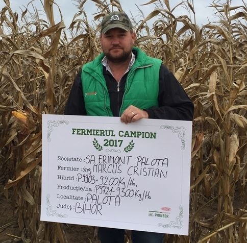 În localitatea Palota - județul Bihor, fermier campion a devenit domnul Cristian Mărcuș, care a obținut cu hibridul P9721 - 9.300 și 9.200 kg/ha cu hibridul P9903. “Lucrez 1.500 ha, iar anul trecut am avut porumb pe 540 ha, semănat după grâu și rapiță, încerc să evit monocultura. Am arat din toamnă, în primăvară am efectuat una sau două treceri cu combinatorul, după cum a fost cazul. Am aplicat 250 kg/ha complex triplu 15 și îngrășământ starter - 25 kg/ha, după care am început semănatul în data de 28 martie. Am erbicidat și în postemergență și preemergență, la prășit, în faza de 6-8 frunze, am mai aplicat 180 kg/ha azotat de amoniu. Am recoltat începând cu luna octombrie, am fost mulțumit de producții, pot spune că au fost producții medii pe fermă. Anul acesta voi semăna porumb pe 700 ha, am ales hibrizii P9903, P9721, P0023, P9241, P0412”, a punctat fermierul campion.