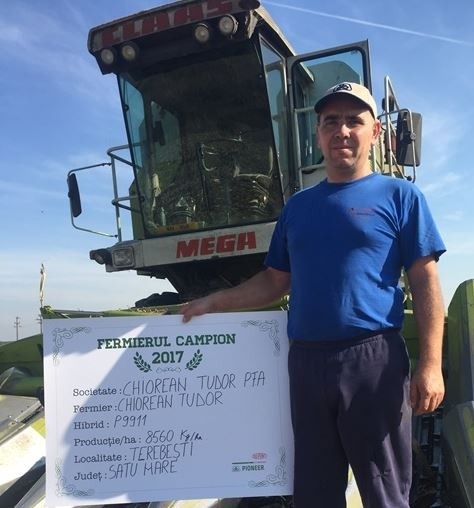 Hibridul P9911 i-a asigurat fermierului Tudor Chiorean din localitatea Terebești, județul Satu Mare, 8.560 kg/ha și astfel a devenit fermier campion. Acesta lucrează 450 ha, iar anul trecut a avut porumb pe 180 ha, semănat după grâu. “Ca de fiecare dată, ar din toamnă la 30 cm, în primăvară am aplicat înainte cu 3 săptămâni înainte de semănat îngrășăminte complexe complexe triplu 16 – 300 kg/ha, iar pregătirea patului germinativ a constant în efectuarea unei treceri cu combinatorul și discuit. Am semănat la începutul lunii mai, în faza de de 10-12 frunze am prășit și am aplicat 200 kg/ha de nitrocalcar. Cultura a beneficiat de o erbicidare, iar producția a fost obținută în nerigat. Am fost mulțumit de evoluția culturii, am recoltat începând cu prima decadă a lunii octombrie. Pentru acest an am ales hibridul P9911 și voi semăna în jur de 200 ha”, a conchis fermierul campion.