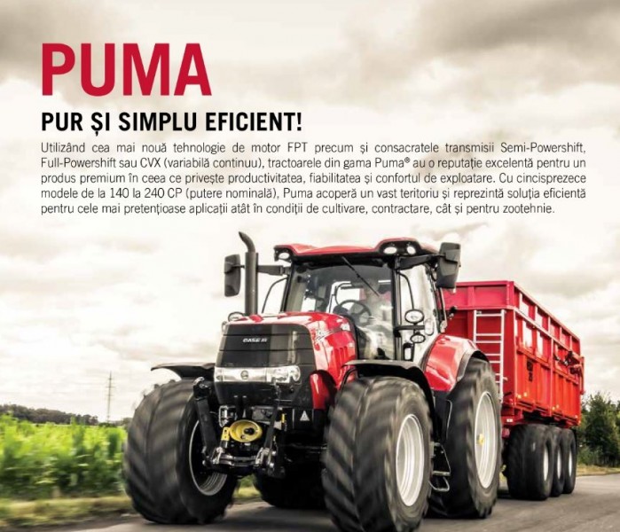 Utilizând cea mai nouă tehnologie de motor FPT precum și consacratele transmisii Semi-Powershift, Full-Powershift sau CVX (variabilă continuu), tractoarele din gama Puma® au o reputație excelentă pentru un produs premium în ceea ce privește productivitatea, fiabilitatea și confortul de exploatare. Cu cincisprezece modele de la 140 la 240 CP (putere nominală), Puma acoperă un vast teritoriu și reprezintă soluția eficientă pentru cele mai pretențioase aplicații atât în condiții de cultivare, contractare, cât și pentru zootehnie.