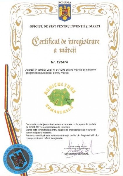 Certificat de inregistrare a marcii AgriculturaRomaneasca