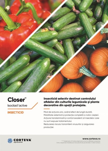 Pentru combaterea cu succes a afidelor din culturile de ardei, castraveti, dovlecei, crisanteme, galbenele, gerbera, pepeni galbeni, tomate, vinete si plante decorative , compania Corteva a lansat începând cu anul 2020 insecticidul CLOSER™, care are la bază o substanță activă nouă, sulfoxaflor, denumită sub numele de brand Isoclast™ active.
