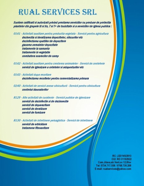 Suntem calificati si autorizati privind prestarea serviciilor cu produse de protectia plantelor din grupele Xi si Xn, T si T+ de toxicitate, precum si a serviciilor de igiena publica urmatoare: