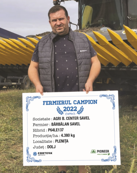 Una dintre cele mai bune producții din județul Dolj le-a obținut domnul Săvel Bărbălan. Este vorba despre o producție de 4.380 kg/ha obținută cu hibridul P64LE137. “Lucrăm în cadrul a trei societăți 1.160 ha, iar floarea-soarelui am avut anul acesta pe aproximativ 400 ha. Planta premergătoare a fost grâul, astfel că după recoltatul acestuia, terenul a fost scarificat și apoi arat, iar în primăvară a fost pregătit cu combinatorul. Anul acesta fost primul an în care nu am putut administra niciun fel de îngrășământ complex. Semănatul l-am început pe 4 martie și a durat cca. o săptămână și jumătate. La semănat am administrat uree - 200 kg/ha, apoi am erbicidat o singură dată în stadiul de 4-8 frunze, am efectuat o prașilă mecanică și am mai fertilizat în vegetație cu încă 100 kg/ha de uree. Am aplicat un tratament cu fungicid și insecticid și am mai avut o trecere cu un aminoacid. Aceasta a fost toată tehnologia și pot spune că nu am avut niciun fel de problemă cu hibridul P64LE137. A fost primul an în care l-am semănat, dar am obținut o producție foarte bună și de aceea anul viitor îl voi semăna pe aproximativ 200 ha”, a punctat fermierul campion.
