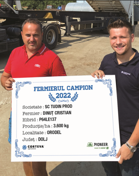 Cristian Dinuț din localitatea Orodel a obținut în acest an 3.600 kg/ha cu hibridul P64LE137 și a devenit fermier campion. “Lucrez 1.000 ha în cadrul a două societăți, iar floarea-soarelui am avut pe 285 ha. Pentru zona noastră producția pe care am obținut-o a fost una foarte bună. Acest hibrid a fost semănat după orz, astfel că terenul a fost arat și pregătit cu combinatorul. Am semănat la începutul lunii aprilie, atunci am fertilizat cu îngrășământ complex 5:30. În vegetație am efectuat o prașilă mecanică și am fertilizat pe rând cu nitrocalcar - 200 kg/ha, am erbicidat cu Express și atât, nu am administrat nici insecticid, nici fungicid, nici foliar pentru că nici nu a fost prezentă nicio boală, nu am avut deloc probleme în cultură. Singura problemă a fost seceta, dar chiar și așa, pentru zona noastră unde producțiile nu prea au depășit 2.000 kg/ha, producția de 3.600 kg/ha pe care am obținut-o cu P64LE137 a fost mai mult decât mulțumitoare. Este un hibrid bun, l-am avut și anii trecuți și a oferit cea mai bună producție din fermă și cu siguranță îl voi semăna anul viitor”, a afirmat fermierul campion.