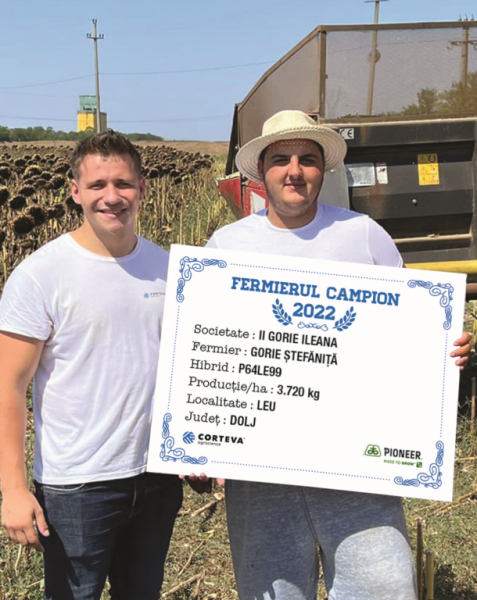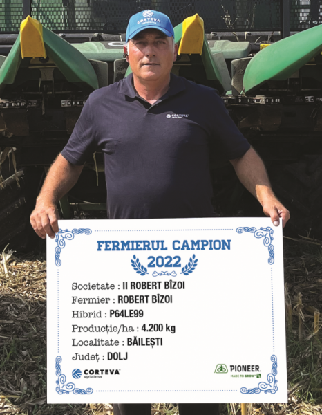 Următorul fermier campion din județul Dolj este domnul Robert Bizoi. Acesta își desfășoară activitatea în localitatea Băilești și a obținut 4.200 kg/ha cu hibridul P64LE99. “Lucrez 115 ha, iar floarea-soarelui am avut pe 35 ha în acest an. Cultura premergătoare a fost grâul, de aceea am făcut un ogor de vară, adică am scarificat, după care în toamnă am arat, iar în primăvară, la final de februarie, am fertilizat cu îngrășământ complex 18.46.0 – 150 kg/ha și am dat cu discul. În cea de-a doua jumătate a lunii martie, înainte de semănat, am intrat cu un compactor și o dată cu semănatul am administrat 150 kg/ha de azot. Am efectuat o prașilă, am erbicidat în stadiul de 2-6 frunze cu erbicidul Express și am administrat un îngrășământ foliar. Nu am mai administrat nimic altceva. Am început recoltatul pe 18 august și pot spune că am fost foarte mulțumit de hibridul P64LE99 pe care îl cultiv de mai mulți ani și în următoarea campanie voi semăna acest hibrid pe toată suprafața destinată florii-soarelui”, a declarat domnul Bizoi.