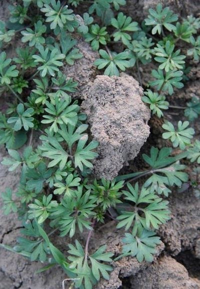 5. Descriere plantă: plantă cu tulpina erectă, ramificată, înaltă de 20-40 cm, Frunze 2-3 ori fidate, mai scurte decât pedunculii, flori în raceme rarite, cu flori albastre violet, cu un pinten de 2 cm. Folicula este glabră, cu semințe aspre datorită unor solzi proeminenți.