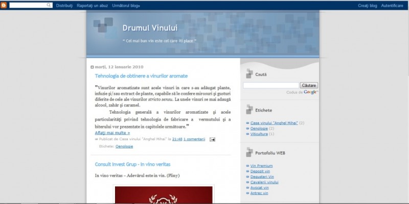 Acesta este un blog ce prezintă informatii prețioase legate de vinurile românești. Cuprinde istoricul oenologic al țării, podgoriile din țară dar și tehnologiile de obținere a vinurilor.
