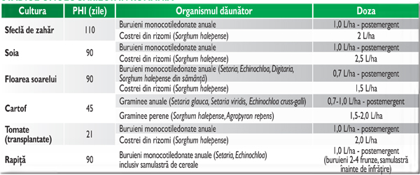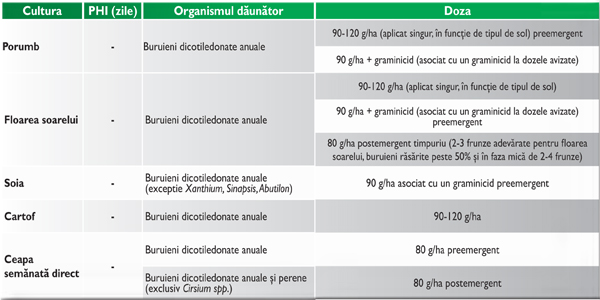 • APLICARE PREEMERGENTĂ – se aplică la culturile de porumb, floarea soarelui, soia, cartof. Combate buruienile dicotiledonate anuale şi inhibă creşterea unor specii de buruieni monocotiledonate. Prezintă acţiune peliculară reziduală.