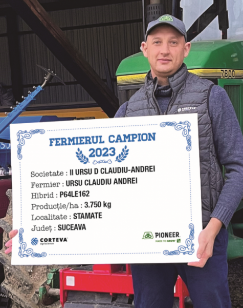 În județul Suceava, localitatea Stamate, un alt fermier campion a fost domnul Andrei Claudiu Ursu, care a obținut 3.750 kg/ha. “Lucrăm în familie 170 ha, floarea-soarelui am avut pe 55 ha, iar cultura premergătoare a fost porumbul. Terenul a fost arat, pregătit minim cu un cultivator în primăvară și am semănat în a doua jumătate a lunii aprilie, atunci am administrat pe rând NPK - 200 kg/ha. Am erbicidat atât preemergent, cât și postemergent și am administrat un singur tratament format din fungicid, insecticid și îngrășământ foliar pe bază de bor. Recoltatul a avut loc în perioada 15 septembrie – 10 octombrie, a fost al doilea an când am ales acest hibrid și am fost mulțumit de producția obținută”, a punctat domnul Ursu.