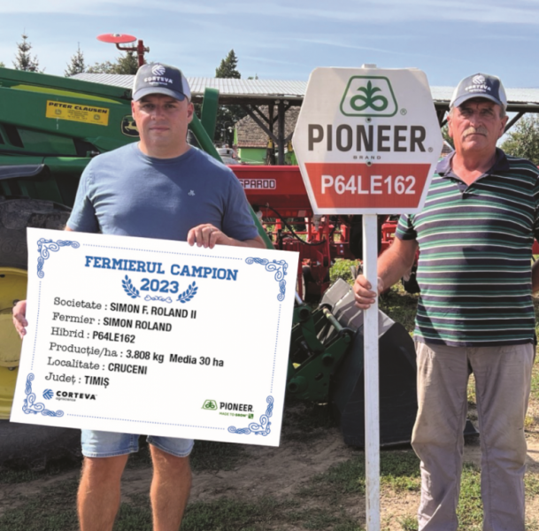 Domnul Roland Simon, din județul Timiș, un alt fermier campion, a obținut o producție de 3.808 kg/ha. „Lucrăm 230 ha, am avut în jur de 50 ha cu floarea-soarelui, dintre care 30 ha cu hibridul P64LE162 și diferența cu hibridul P64LE99. Cultura premergătoare a fost orzul, jumătate din suprafață a fost arată, jumătate scarificată, la finalul iernii am discuit, iar înainte de semănat am pregătit terenul cu combinatorul. La pregătirea patului germinativ am administrat DAP – 200 kg/ha și 200 kg/ha de uree, apoi am semănat în jur de 15 aprilie. Am erbicidat de două ori, prima oară în stadiul de 2-4 frunze, a doua trecere a fost cu Express®, în stadiul de 6-8 frunze, și atunci am administrat și un fungicid. Insecticide nu a fost cazul să administrez. Am recoltat după data de 15 septembrie și am fost mulțumit de producție, Pentru 2024 am ales din nou hibridul P64LE162 pentru 50 ha”, a declarat fermierul campion.