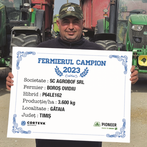 Și în localitatea Gătaia, județul Timiș, cu o producție de 3.600 kg/ha, am avut un fermier campion, domnul Ovidiu Boroș. A semănat 60 ha de floarea soarelui, iar cel mai performant hibrid din fermă a fost P64LE162. “Cultura premergătoare pentru acest hibrid de floarea-soarelui a fost porumbul, astfel că terenul arat, apoi pregătit corespunzător cu combinatorul. Am fertilizat la pregătirea patului germinativ cu 200 kg/ha de uree și am semănat cu 250 kg/ha de îngrășământ complex triplu 15. Am semănat ceva mai târziu, la începutul lunii iunie, dar a fost benefic pentru cultură. Am erbicidat într-o trecere, iar unde a fost nevoie am revenit cu Express® în stadiul de 3-4 frunze. Am avut și două treceri cu îngrășământ foliar pe bază de bor și insecticid de contact, prima oară în stadiul de 4-5 frunze, iar la următoarea intervenție, atunci când plantele erau mai mari, am adăugat și un fungicid. Nu am fertilizat în vegetație, nu am prășit, aceasta a fost toată tehnologia. Am recoltat la începutul lunii octombrie, a fost o recoltă bună, am fost foarte mulțumit și an de an semăn hibrizi Pioneer®.