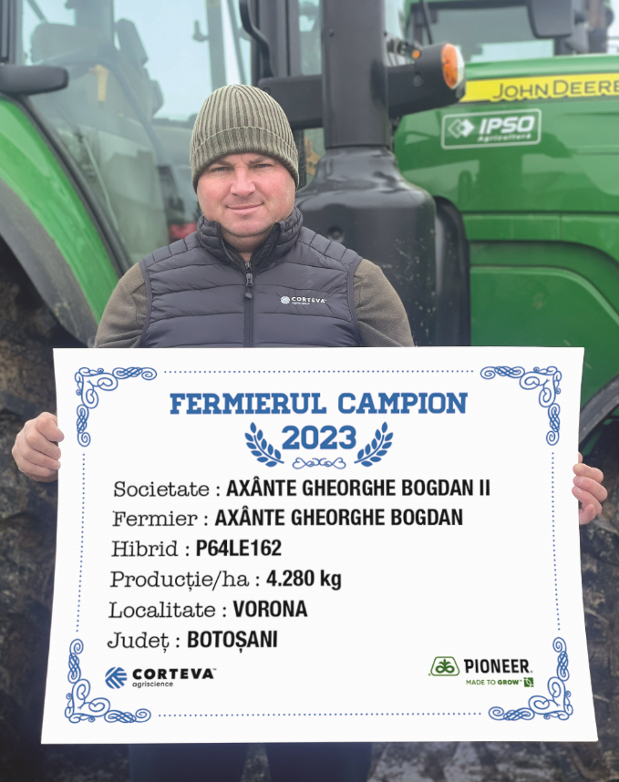 Unul dintre Fermierii campioni la floarea-soarelui cu hibridul P64LE162, a fost domnul Gheorghe Bogdan Axânte din localitatea Vorona, județul Botoșani, care a obținut o producție de 4.280 kg/ha.