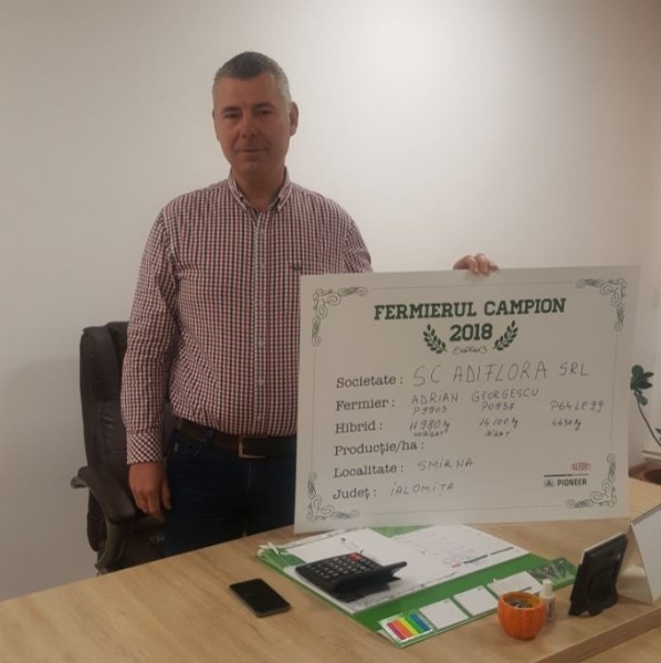 În județul Ialomița, cea mai bună producție la floarea-soarelui a fost cea obținută de Adrian Georgescu, care lucrează 2.600 ha, iar această cultura a ocupat 140 ha. A devenit fermier campion cu producția 4.430 kg/ha garantată de hibridul P64LE99. “Am arat în toamnă și am efectuat o lucrare cu discul, apoi în primăvară am intrat cu combinatorul. Înainte de semănat am aplicat 200 kg/ha îngrășăminte complexe 18.46.0, am semănat la sfârșitul lunii martie - începutul lunii aprilie, iar în ceea ce privește fertilizarea am mai dat la prășit 100 kg/ha de azot. Cultura a primit un erbicid preemergent, un graminicid în vegetație și două fungicide, primul la 6-8 frunze, al doilea în faza de buton floral. Doar atât am aplicat și am recoltat începând cu finalul lunii august”, a declarat fermierul campion.