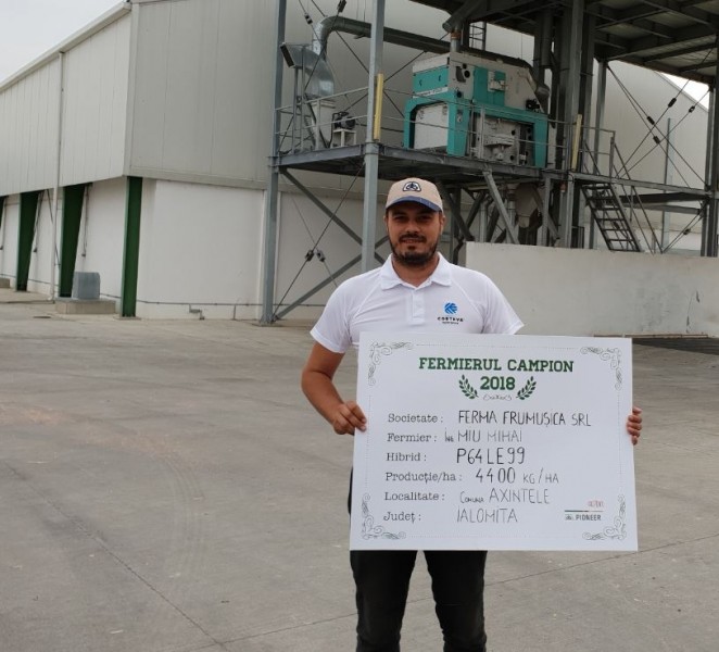 Un alt fermier campion din aceast județ este domnul Mihai Miu, care a ales hibridul P64LE99 și a obținut 4.400 kg/ha. În cadrul fermei lucrează 2.000 ha, iar floarea-soarelui a semănat în acest an pe 120 ha, după culturile de grâu și porumb. “În toamnă am arat la 32-34 cm, iar în primăvară am efectuat o singură trecere cu combinatorul, apoi la semănat, în perioada 14-16 aprilie, am aplicat complexe 20.20.0 – 160 kg/ha. Am aplicat două tratamente cu fungicid, erbicid și îngrășământ foliar, plus azotat de amoniu - 120 kg/ha fazial. Cultura a fost în neirigat și am recoltat în jurul datei de 6 septembrie”, a specificat Mihai Miu. Fermierul campion a mai adăugat faptul că în ceea ce privește hibrizii de floarea-soarelui este foarte mulțumit în special de cei cu tehnologia Express, pe care îi cultivă încă din momentul în care aceștia au fost disponibili pe piața din România.