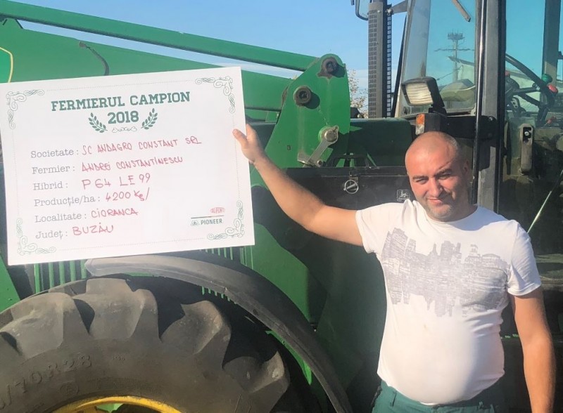 Andrei Constantinescu, tot din județul Buzău, a devenit și el fermier campion datorită hibridului P64LE99, care i-a asigurat producția de 4.200 kg/ha. Acesta lucrează în cadrul a două societăți 400 ha, iar cu floarea-soarelui a avut 110 ha. “Am semănat după grâu și porumb, astfel că în toamnă am arat la minim 30 cm, iar în primăvară am efectuat o trecere cu discul, am fertilizat cu 200 kg/ha 14.14.14 cu sulf și magneziu, încorporat cu combinatorul, apoi la aproximativ după două săptămâni am semănat, adică la începutul lui aprilie, am semănat 70.000 plante/ha și am aplicat 200 kg/ha 20.20.0 și 9 kg/ha îngrășăminte microgranulate starter. S-au mai aplicat două erbicide și doar atât, nu sunt adeptul multor lucrări în vegetație. Am recoltat la finalul lunii august, iar producția din acest an a fost mult peste așteptări. Pentru următoarea campanie nu știu sigur câte hectare voi semăna, pentru că asta depinde de campania de toamnă, oricum vor fi cel puțin 80”, a specificat fermierul.