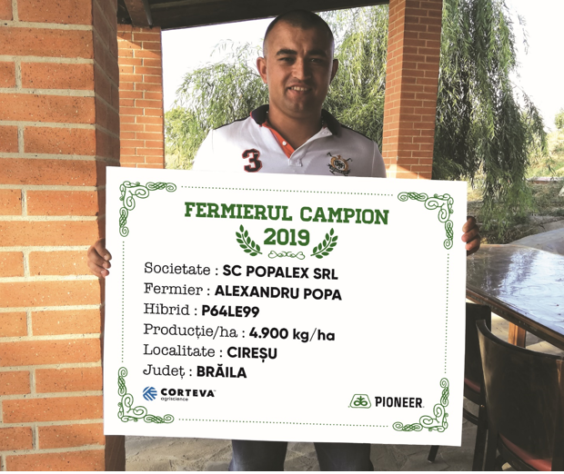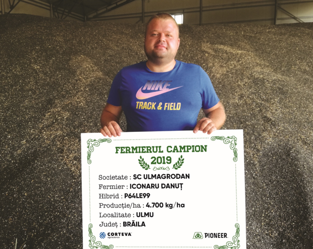Producția obținută în cadrul fermei SC Ulmagrodan SRL – 4.700 kg/ha cu hibridul P64LE99, îi oferă statutul de fermier campion și domnului Dănuț Iconaru. “Lucrez 3.000 ha, iar floarea-soarelui am avut în acest 600 ha, toată suprafața a fost semănată cu hibridul P64LE99. Producția a fost diferită în funcție de solă, am atins și 4.700 kg/ha, iar în final media pe fermă a fost 3.700 kg/ha. Am făcut ogor de toamnă, în primăvară am pregătit terenul cu combinatorul și am semănat după jumătatea lunii aprilie 66.000 plante/ha, atunci am aplicat pe rând 200 kg/ha de îngrășământ triplu 16. Am mai fertilizat cu 200 kg/ha de azot atunci când am prășit. Am erbicidat după semănat și am mai aplicat un erbicid de corecție, iar după 10 zile am aplicat două fungicide și un îngrășământ foliar. Am recoltat la începutul lunii septembrie și pot spune că a fost un an bun, poate ar fi trebuit să aplic fungicidul mai devreme pentru că din cauza precipitațiilor floarea începuse să dea semne de boală. Anul viitor voi semăna în jur de 600 ha cu același hibrid - P64LE99”, a precizat fermierul campion.