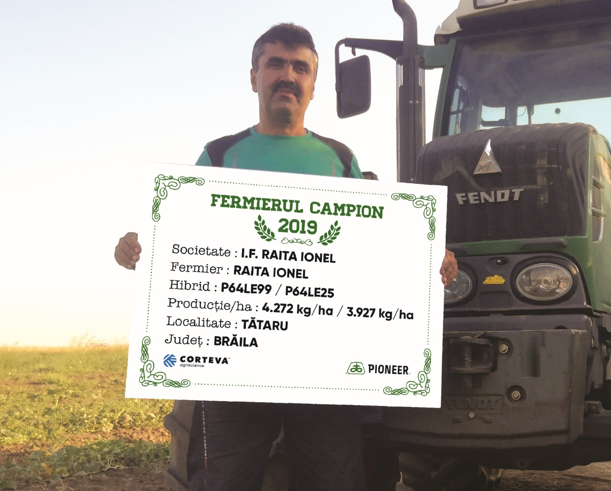 Domnul Ionel Raita este un alt fermier campion din județul Brăila. El lucrează 200 ha în localitatea Tătaru, a semănat floarea-soarelui pe 60 ha și a obținut 4.272 kg/ha cu hibridul P64LE99 și 3.972 kg/ha cu hibridul P64LE25. “Pe toată suprafața am semănat cei doi hibrizi Pioneer®, iar plantă premergătoare a fost porumbul. Am făcut lucrările clasice – arat, discuit, semănat și prășit o dată. Am administrat gunoi de grajd – 20 t/ha înainte de arat, am aplicat la semănat, în perioada 1-4 aprilie, îngrășământ complex 18.46.0 – 200 kg/ha, iar la prășit, atunci când plantele aveau 12-14 frunze, am dat 150 kg/ha azotat. Am mai administrat erbicidul ExpressSun™ și tot atunci am dat un îngrășământ foliar pe bază de bor. Când am putut intra ultima oară în cultura am dat un fungicid și un foliar. Am recoltat în jurul datei de 20 august”, a punctat agricultorul. Acesta a mai adăugat faptul că anul viitor va semăna între 40 – 60 ha cu floarea-soarelui (PE64LE99), pentru a face corect rotația culturilor, dar nu exclude posibilitatea de a încerca și hibrizi noi.