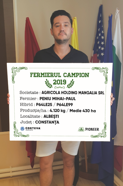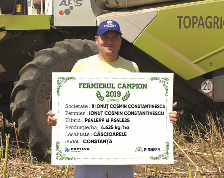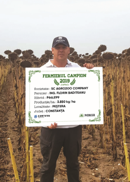 Ionuț Cosmin Constantinescu este primul fermier campion la floarea-soarelui din județul Constanța. Lucrează 230 ha, iar în acest an a semănat 30 ha cu floarea-soarelui, iar datorită hibrizilor P64LE25 și P64LE99 a obținut o producție medie pe fermă de 4.625 kg/ha. “Floarea-soarelui a fost semănată după porumb, de aceea am arat și am discuit. La pregătirea terenului am aplicat 200 kg/ha de uree. În prima parte a lunii aprilie am semănat și am aplicat îngrășământ triplu 15 – 150 kg/ha. Cultura a primit două erbicide, un fungicid și un îngrășământ foliar pe bază de bor – 5 l/ha, iar atunci când am prășit, am aplicat și 150 kg/ha de azotat de amoniu. Recoltatul a avut loc la finalul lunii august, iar în următoarea campanie intenționez să semăn aceeași suprafață cu floarea-soarelui și voi alege hibrizii P64LE99 și P64LE25”, a declarat fermierul campion.