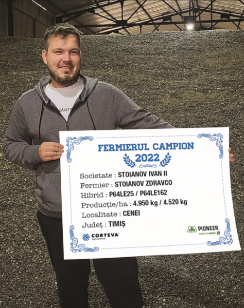 Primul fermier campion la floarea-soarelui din vestul țării este domnul Zdrafco Stoianov din localitatea Cenei, județul Timiș. Acesta lucrează 500 ha, a cultivat hibrizii Pioneer P64LE25 și P64LE162 și a obținut producții mai mult decât mulțumitoare pentru acest an, respectiv 4.950 kg/ha cu primul hibrid și 4.520 kg/ha cu cel de-al doilea. “Anul acesta am avut 220 ha cu floarea-soarelui și am semănat fie după grâu, fie după orz. Pe solele unde am avut grâu, terenul a fost scarificat, după care a urmat aratul și pregătirea terenului, iar pe solele cu orz am arat și am pregătit terenul. În fermă, o dată la 3 ani, scarific terenul. Pregătirea terenului a avut loc în două treceri cu combinatorul, am semănat și am aplicat pe rând azotat de amoniu – 200 kg/ha. În vegetație am mai fertilizat cu 5 litri de îngrășământ lichid, nu a fost nevoie și de altceva, restul elementelor fiind prezente în sol. Am erbicidat cu Express și doar atât, nu a fost nevoie de alte intervenții în cultură. Am început recoltatul la începutul lunii septembrie și producțiile au fost foarte bune pentru un an atât de secetos. Cei doi hibrizi au oferit cele mai ridicate producții din fermă”, a precizat fermierul campion. În următoarea campanie va semăna floarea-soarelui pe 180 ha și va alege aceiași hibrizi Pionner, respectiv P64LE162, P64LE25 și P64LE99 pentru că mereu au oferit producții ridicate.