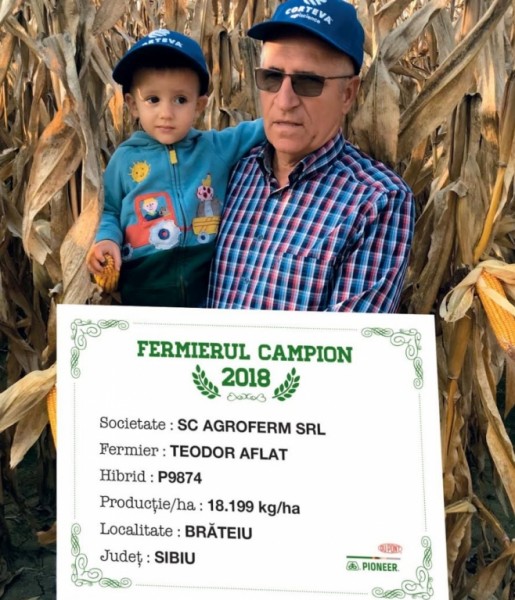 În acest an unul dintre fermierii care a avut cele mai bune rezultate cu hibrizii Pioneer este domnul Teodor Aflat din localitatea Brateiu, județul Sibiu. Cea mai mare producție a obținut-o cu hibridul P0937 – 19.702 kg/ha, următorul hibrid din top a fost P1275 – 19.587 kg/ha, urmat de P9874 - 18.199 kg/ha și P9757 – 17.907 kg/ha. “Lucrez în jur de 8.000 ha, dintre care anul acesta 1.950 ha au fost semănate cu porumb. Pe unele parcele am obținut producții foarte bune, chiar excepționale, așa cum reiese și din fotografii. Principalele culturi după care am semănat au fost grâul, sfecla și am semănat chiar și după porumb. Lucrările pentru pregătirea terenului le-am început din toamnă și astfel am scarificat sau arat, a depins de solă, pot spune că jumătate din suprafață a fost arată, jumătate scarificată. În primăvară am lucrat terenul cu grapa și am început campania de semănat pe data de 9 aprilie. Am fertilizat 150 kg/ha de îngrășăminte complexe 18.46.0, am aplicat și uree în două tranșe, în total 250 kg/ha. Am aplicat în luna mai un îngrășământ foliar cu zinc, iar în ceea ce privește erbicidele am aplicat fie unul singur, fie două unde a fost cazul. Jumătate din suprafață a fost prășită, iar campania de recoltat a debutat în data de 2 septembrie. A fost un an bun, cu producții bune, de aceea voi semăna porumb anul viitor pe aproximativ 2.000 ha și voi alege cu siguranță aceeași hibrizi Pioneer”, a declarat fermierul campion.