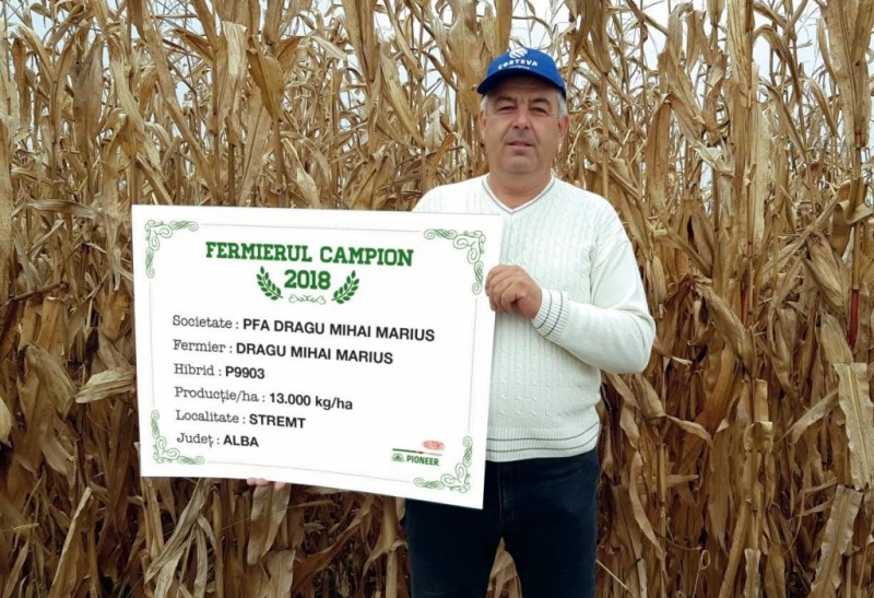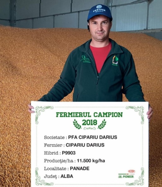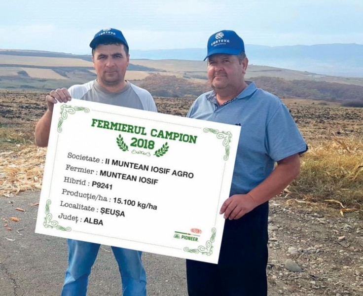 În județul Alba primul fermier campion este Iosif Muntean care a semănat hibridul P9241 și a obținut 15.100 kg/ha. “Lucrez 300 ha, iar porumb am avut pe 200 ha și am semănat în principal după floarea-soarelui, grâu și lucernă. În toamnă am scarificat și am aplicat gunoi de grajd, pentru că eu am și o fermă de vaci. În primăvară am continuat lucrările, așa că am intrat cu freza apoi am semănat la jumătatea lunii aprilie. La semănat am aplicat îngrășăminte 20.20.0 - 350 kg/ha, iar în vegetație am mai aplicat azotat – 150 kg/ha. Erbicide am aplicat în două tranșe, unul după semănat și cel de al doilea a fost de corecție. Nu am aplicat nici un fel de tratament și nici nu am prășit, iar campania de recoltat am început-o în luna octombrie. În primăvară voi semăna tot în jur de 200 ha, aceeași hibrizi Pioneer, poate și ceva nou. Anul acesta a fost de excepție, pentru toți hibrizii, iar la hibrizii Pioneer s-a văzut diferența, în plus spun, deci am fost mulțumit”, a punctat agricultorul.