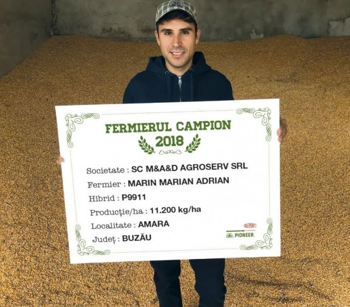 În localitatea Amara din județul Buzău își desfășoară activitatea următorul fermier campion: Marin Marian Adrian. Acesta a semănat în acest an 250 hectare cu porumb, iar în fermă lucrează 600 hectare. Cea mai bună producție la această cultură a obținut-o cu hibridul P9911, care i-a oferit 11.200 kg/ha. “Culturile premergătoare pentru porumb au fost floarea-soarelui, lucernă, mazăre și am semănat chiar și după cultură de porumb. În toamnă am arat la 40 cm și am fertilizat cu 250 kg/ha îngrășăminte complexe 20.20.0. Am continuat lucrările pentru pregătirea patului germinativ în primăvară, atunci când am efectuat două treceri cu combinatorul și am aplicat 200 kg/ha de uree. Campania de semănat a început în jur de 15 aprilie și o dată cu semănatul am mai aplicat azot – 130 kg/ha. În vegetație am dat un erbicid, în faza de 10 frunze am prășit și am aplicat un tratament cu fungicid și foliar, iar recoltatul a avut loc în perioada 5-7 septembrie”, a specificat Marin Marian Adrian.