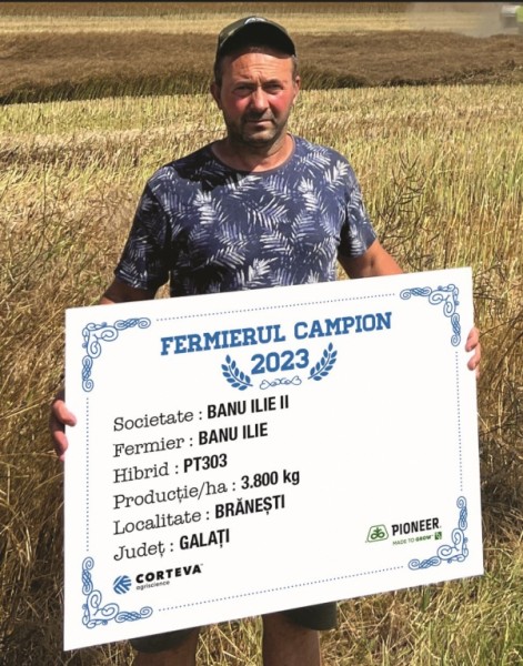 În localitatea Brănești din județul Galați își desfășoară activitatea următorul fermier campion, domnul Ilie Banu. Acesta lucrează 800 ha de teren, iar rapiță a semănat pe 155 ha, iar hibridul PT303 Sclerotinia Protector i-a oferit 3.800 kg/ha. “Am semănat acest hibrid după grâu, astfel că terenul a fost arat, apoi pregătit cu discul în 2-3 treceri și combinatorul, apoi am semănat după data de 20 septembrie. În toamnă nu am administrat nimic, iar în primăvară am fertilizat cu azot - 200 kg/ha, am administrat și două tratamente formate din fungicid, insecticid și îngrășământ foliar, primul a fost administrat înainte de îmbobocire și al doilea la scuturarea florilor. Aceasta a fost toată tehnologia, iar recoltatul a avut loc începând cu 10 iulie”, a punctat fermierul campion. În această campanie domnul Banu intenționează să semene rapiță pe 200 ha.
