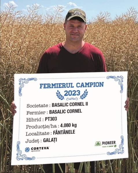 Un al fermier campion din județul Galați este domnul Cornel Basalic. Acesta lucrează 264 ha dintre care, 100 ha au fost destinate în acest an culturii de rapiță, iar hibridul Pioneer PT303 Sclerotinia Protector i-a oferit acestuia o producție de 4.080 kg/ha. “Am semănat acest hibrid după cultura de grâu, astfel că terenul a fost arat la adâncimea de 30-32 cm, apoi, după 1-2 zile a fost discuit. Semănatul a avut loc în 20 august și am fertilizat cu îngrășăminte complexe 200 kg/ha. În toamnă am aplicat un insecticid, iar în primăvară, pe 8 martie, am administrat 150 kg/ha de uree; în jurul datei de 15 martie, la începutul alungirii tijei, am administrat primul tratament cu fungicid și insecticid, iar ultimul tratament a constat în aplicarea unui fungicid cu trei substanțe active și insecticide sistemice și de contact, la apariția butonului floral. A fost un an bun și în precipitații, iar hibridul s-a comportat foarte bine, este rezistent la boli și nu am întâmpinat probleme cu el”, a afirmat fermierul campion. Acesta a mai adăugat că pentru această toamnă a ales hibrizii Pioneer PT303, PT314, PT315, fiecare pentru câte 30 ha și PT298 pentru 10 ha.