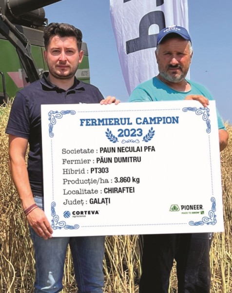 Domnul Dumitru Păun din localitatea Chiraftei, județul Galați, a devenit fermier campion datorită hibridului PT303 Sclerotinia Protector care i-a oferit o producție medie de 3.860 kg/ha. “Lucrez 800 ha, rapiță am avut pe 158 ha și am semănat după grâu. După recoltatul grâului am pregătit terenul corespunzător cu Tiggerul și Jokerul și am semănat în perioada 10-15 august. În toamnă am avut o singură intervenție în cultură cu un insecticid și un erbicid. Am fertilizat doar în primăvară, mai întâi cu 286 kg/ha de uree și apoi cu azot - 100 kg/ha. În ceea ce privește tratamentele de primăvară, am administrat un fungicid, un îngrășământ foliar și insecticidul Inazuma. Am recoltat în perioada 24 iunie – 5 iulie, și pot spune că a fost un an bun pentru rapiță”, a declarat domnul Păun. Acesta a mai precizat faptul că a fost foarte mulțumit de hibridul PT303 și intenționează să semene în această campanie cca 200 ha cu rapiță.