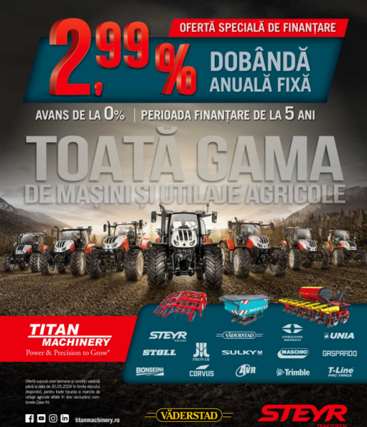 Atenție! Oferta de finanțare utilaje agricole cuprinde întreg stocul de utilaje agricole cu excepția combinelor și presupune o dobândă de 2,99%, cu avans de la 0% și o perioadă de finanțare de la 5 ani. Oferta este supusă unor termene și condiții și este valabilă până la data de 30 iunie 2024.