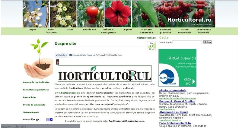www.Horticultorul.ro este un site destinat horticultorilor și pasionaților de horticultură unde puteți găsi o vastă informație despre îngrijirea gradinilor sau a plantelor de apartament dar și informații legate de domeniile de specialitate ale Horticulturii și anume cele legate de producerii de fructe, flori, struguri, vin, legume, arbori și arbuști ornamentali.