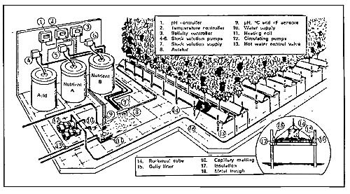 Asadar, instalatia hidroponica este formata din bazine de vegetatie, substrat, rezervor pentru solutia nutritiva, pompe de circulare, sistem de conducte tur-retur. Dimensiunile bazinelor sunt de: 1,2 m latime, 0,25-0,3 m adancime, lungimea fiind variabila. Caracteristica de baza a bazinelor este etanseitatea perfecta . Ele sunt legate in sistem tur-retur cu conducte, irigarea realizandu-se fie separat pe grupuri de bazine, fie simultan in toate bazinele. Modul de irigare ales determina si dimensiunile bazinului. Bazinul trebuie sa aiba o inclinatie longitudinala de 0,2% a fundului pentru a fi posibila recuperarea solutiilor. De asemenea, fundul bazinelor trebuie sa detina un sistem de tuburi de dren pentru a facilita scurgerea rapida a substantelor.