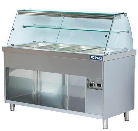 Modul Bain Marie cu vitrina de prezentare si suport neutru deschis, constructie inox, capacitate 4xGN 1/1 (neincluse), iluminare, temperatura de lucru +30…+90 grade, control termostatic, robinet de scurgere, picioare reglabile, alimentare 220V, putere 3x0,8Kw, dimensiuni 1470x700x850/1290mm. COD: 251610. Pret: 1270 Euro. Website: www.echipamentehoreca.ro, Tel: 0731 347 077