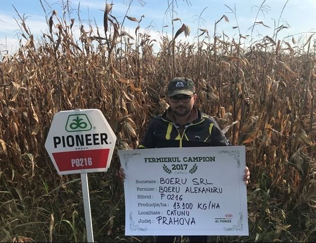 În județul Prahova, localitatea Cătunu, fermier campion a devenit domnul Alexandru Boeru, care a obținut 13.100 kg/ha cu hibridul P0216. “Lucrez 550 ha, iar cu porumb am semănat anul trecut 230 ha. Culturi premergătoare au fost fie tot porumb, grâu, rapiță sau floarea-soarelui. În toamnă am arat, adâncimea a diferit în funcție de solă între 25-35 cm, iar în primăvară am efectuat o trecere cu combinatorul după care am semănat în jurul datei de 3 aprilie, când am aplicat triplu 16 - 300 kg/ha și biostimulator starter. Am fertilizat și în vegetație, mai bine spus când am prășit în faza de 8 frunze, cu 300 kg/ha de azot. În ceea ce privește erbicidele, unde a fost cazul am folosit și preemergent, iar în postemergență, în 3-4 frunze, când am aplicat erbicide monocotiledonate și dicotiledonate. Iar în faza de 10 frunze am mai efectuat o fertilizare. Recoltatul porumbului l-am început după 15 octombrie. Pot spune că a fost un an fără probleme la culturile de porumb cu hibrizii Pioneer, de aceea pe 90% din suprafața cultiv doar hibrizii Pioneer. Pentru acest an am ales deja hibrizii P0216, P9911, P9903, P9900”, a punctat fermierul campion.