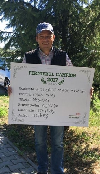 Cel de al treilea fermier din județul Mureș care a devenit fermier campion cu hibridul PR34Y02 este agricultorul Tamaș Nagy, care a obținut 63 t/ha. “În fermă gestionăm 580 ha, cu tot cu pășuni. De obicei semăn porumbul după lucernă, pentru că avem multe culturi ce ne sunt necesare în zootehnie. În general cultiv mai mulți hibrizi Pioneer și pentru boabe, dar pentru siloz am avut nul trecut PR34Y02. Pentru că am animale, terenurile beneficiază și de gunoi de grajd. Am început pregătirea terenului în toamnă am arat, iar în primăvară am efectuat o lucrare cu freza. La semănat, la sfârșitul lunii aprilie, început de mai și am făcut 2 loturi, pe care le-am semănat la distanța de 2 săptămâni. Am aplicat îngrășăminte 20.20.0 – 300 kg/ha, iar în vegetație am mai dat între 150 și 200 kg/ha uree. Am aplicat un singur erbicid. Pe lotul semănat mai târziu am avut producții mai bune pentru că au fost precipitații exact când se forma știuletele. Am recoltat la mijlocul lunii septembrie, porumbul pentru siloz, iar la început de octombrie am recoltat celelalte loturi unde am avut hibrizi pentru boabe. Producțiile au fost bune în acest an, mai ales unde am semănat după lucernă. În acest an am ales deja hibrizii, dar mă interesează mai ales cei pentru siloz, de aceea voi face și câteva loturi demonstrative în acest an pentru a avea și pe viitor o colaborare cât mai bună pe această parte”, a declarat fermierul campion, Tamaș Nagy.