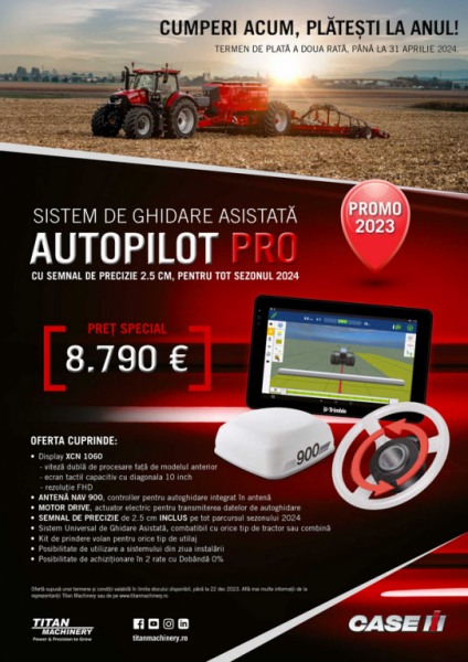 Titan Machinery România desfășoară în perioada care a mai rămas din acest an 2023 o ofertă de preț pentru Sistemul de Ghidare Asistată AUTOPILOT PRO de 8.790 de euro. Această ofertă cuprinde și abonament gratuit pentru semnalul de precizie de 2,5 cm - RTK+, pentru întreg anul 2024.