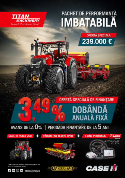 Titan Machinery România a lansat o nouă ofertă de finanțare, de această dată la un pachet de utilaje imbatabil, care cuprinde tractor Case IH Puma 200, semănătoare de precizie Väderstad Tempo F 8 + sistem de autoghidare T-Line Protrack, cu semnal de precizie RTK+ de 2.5 cm, totul la un preț special total de 239.000 €.
