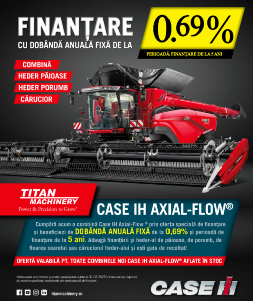 Ofertă este supusă unor termene și condiții și este valabilă până la 31 martie 2025, pentru o perioadă de finanțare de 5 ani, în limita stocului disponibil. Află mai multe informații de la reprezentanții Titan Machinery România, accesând link-ul de mai jos, respectiv punctul de lucru din țară cel mai apropiat de dumneavoastră.