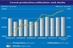 Se estimeaza o crestere record fata de 2011 de circa 1.4 % (2370 t) in special la boabele de orz si grosiere in timp ce la grau se prevede o scadere , la cerealele folosite in producerea de biocarburanti se prevede o stagnare dupa mai multi ani de crestere.Comertul cu cereale pentru anul 2012/13 se estimeaza a ajunge la 295.5 milioane tone in usoara crestere fata de anul trecut. Indicele de pret mediu la cereale in luna aprilie se afla in scadere cu aproximativ 23% mai mic la porumb ,15% la porumb si orez 4%.