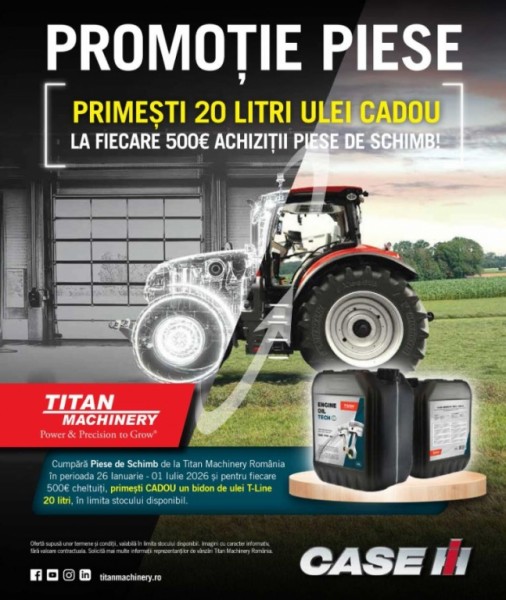 Cumpără Piese de Schimb de la Titan Machinery România în perioada 26 Ianuarie - 01 Iulie 2026 și pentru fiecare 500€ cheltuiți, primești CADOU un bidon de ulei T-Line 20 litri, în limita stocului disponibil.
