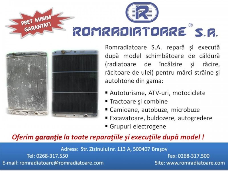 Romradiatoare S.A. repara si executa dupa model schimbatoare de caldura pentru marci straine si autohtone din gama: