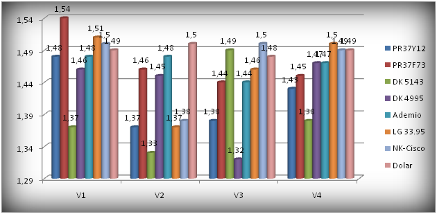 Costurile medii de productie pe fiecare varianta sunt: V1 – 1,47 ron/kg; V2 – 1,41 ron/kg; V3 – 1,43 ron/kg si respectiv V4 – 1,46 ron/kg; iar costurile medii pentru hibrizi variaza intre 1,39 ron/kg la DK5143 si 1,49 ron/kg la Dolar (Figura 6).