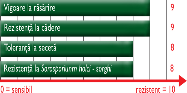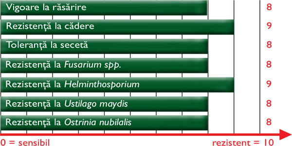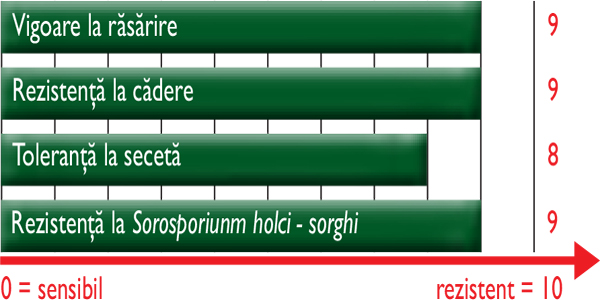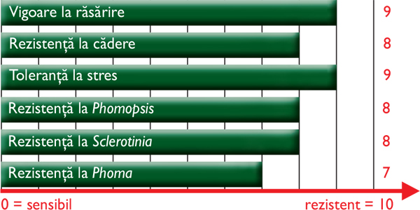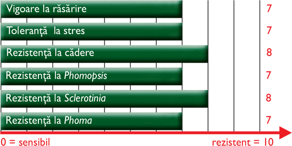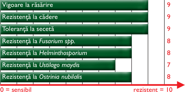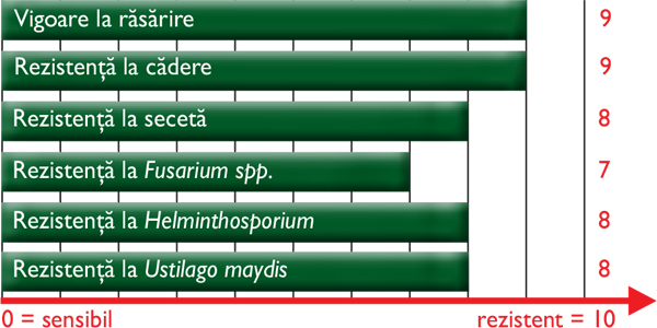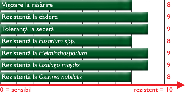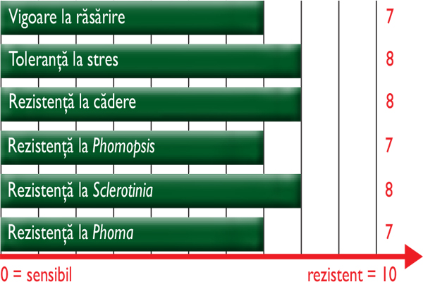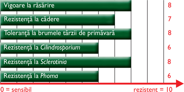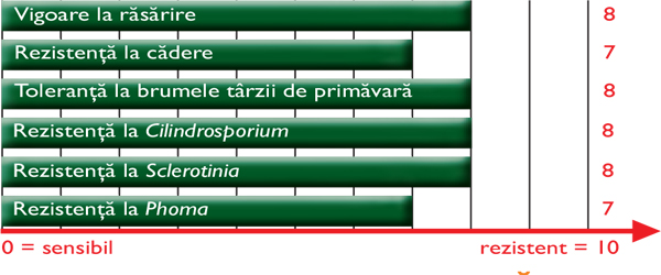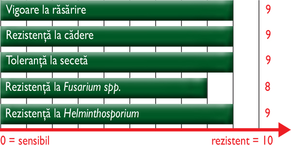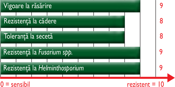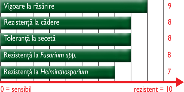 • Rezistenţă bună la căderea plantelor (având nota 1,75 - unde 1 este foarte rezistent şi 9 foarte sensibil).